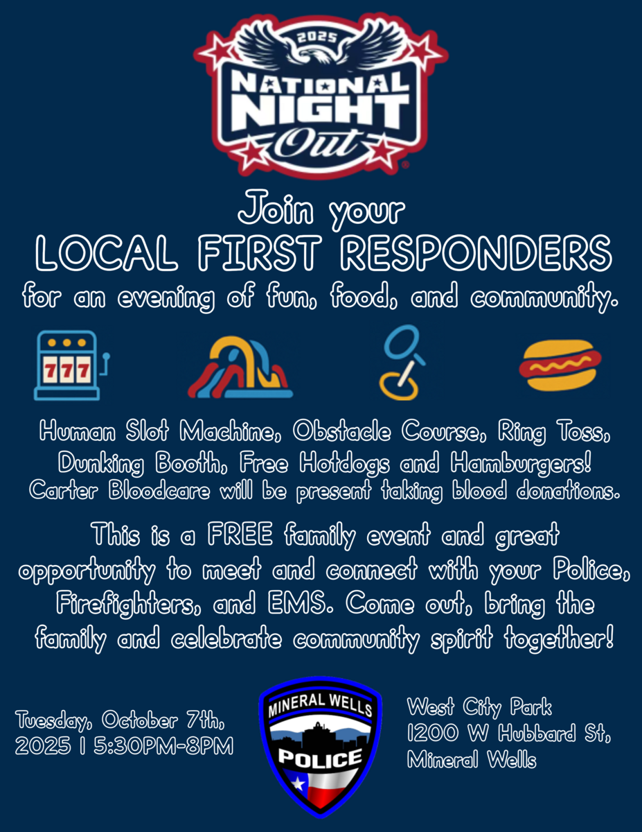 Dear MWISD Families, We invite you to join us for National Night Out with our local first responders ! This free family event will include games, food, and fun for all ages. Its also a wonderful o. . .